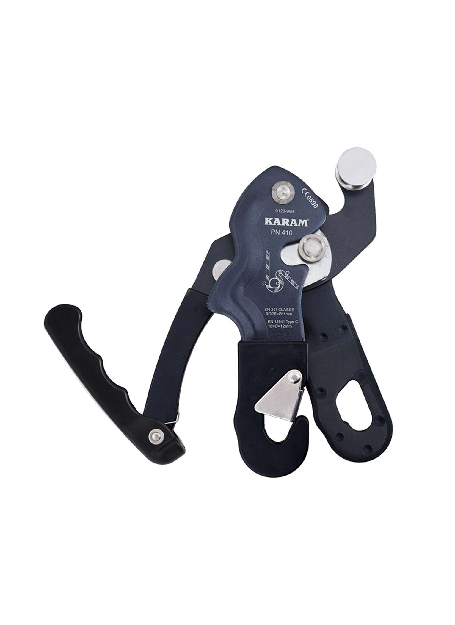 Equipped with a unique self-braking system that initiates the brake as soon as the handle is released or clasped too tightly. It is provided with a safe locking eye which prevents the rope from sliding out when operating as a descender. Has a Polymer-coated cover for comfort and ease during descent.